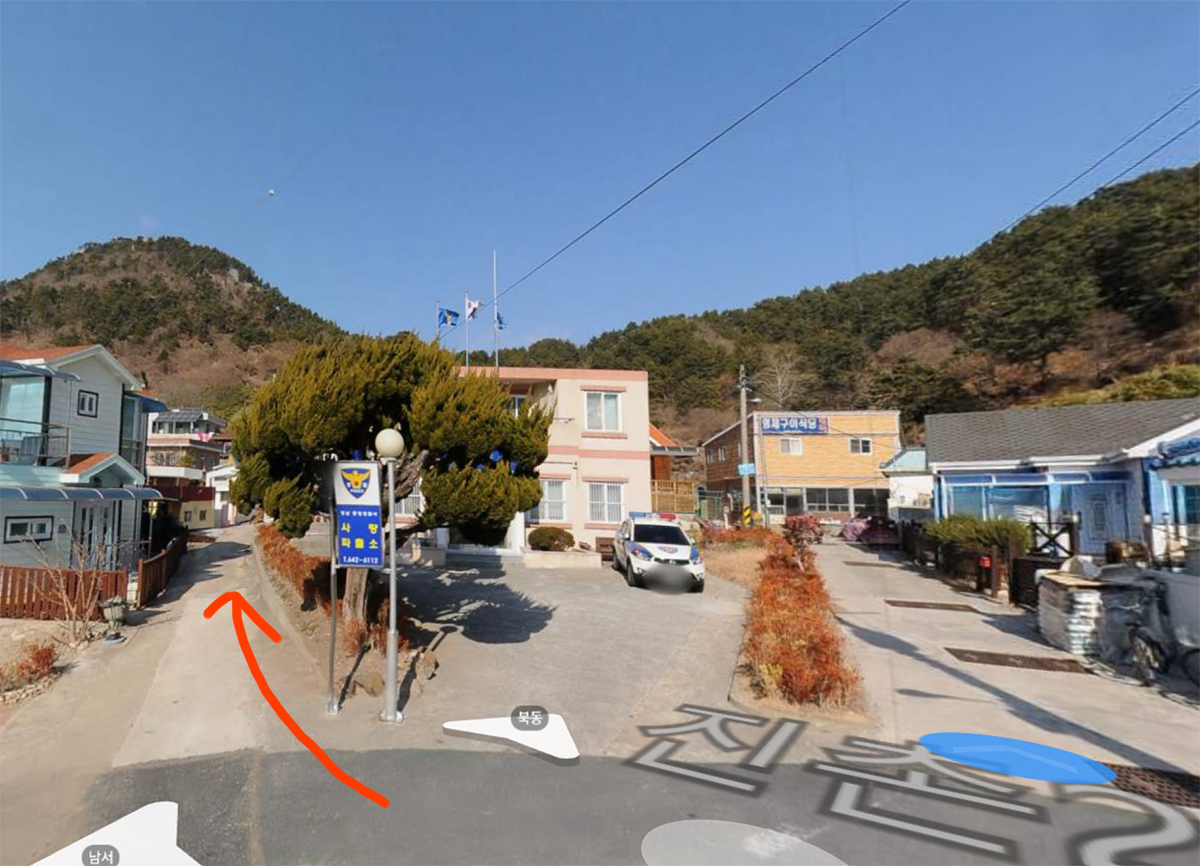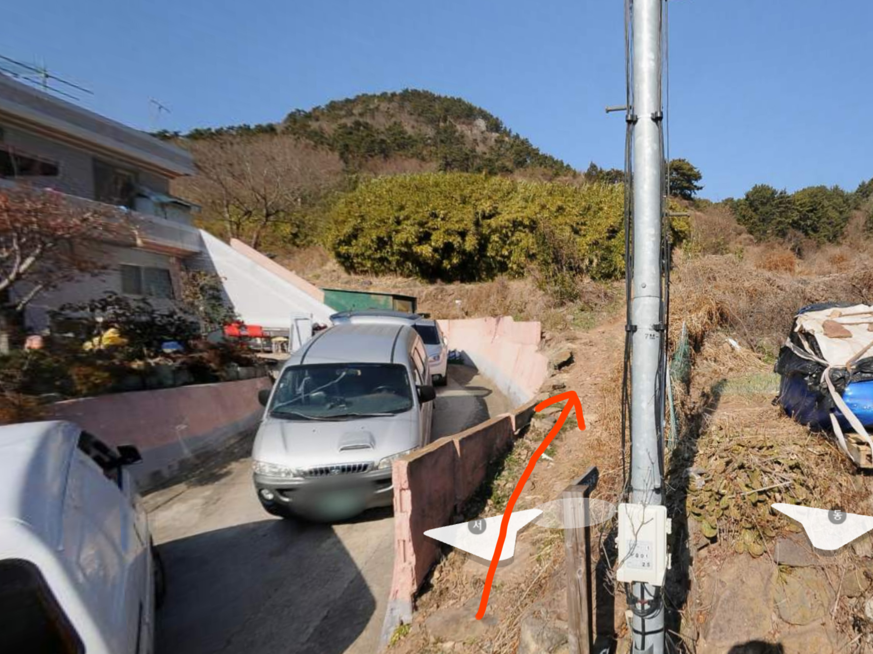 첫 번째는 경찰서 옆으로 해서 바로 가로질러가는 짧은 코스(A코스)와 사량대교 입구에서 출발하는 둘러가는 코스가 있습니다. 저의 등산코스는 짧은 A코스로 진입했습니다.